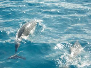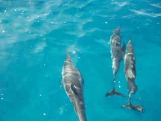白いお腹を出してお母さんイルカと一緒に泳ぐ子供イルカもいましたよ!