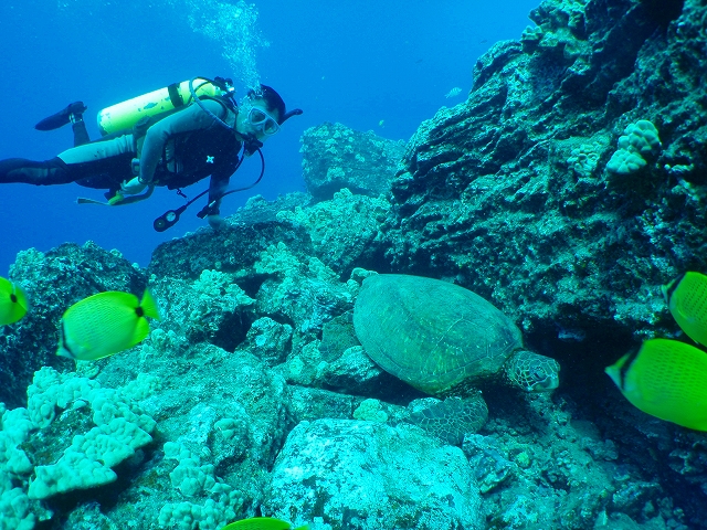 今日はジムのガイドでノースショアーの1)シャークスコーヴ ?2)センターで潜りました。